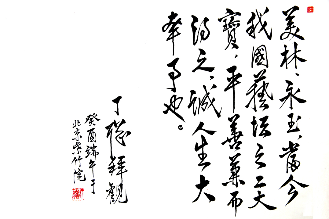 平善兼而得之,诚人生大幸事也。丁聪拜观,癸酉端午于北京紫竹园”。